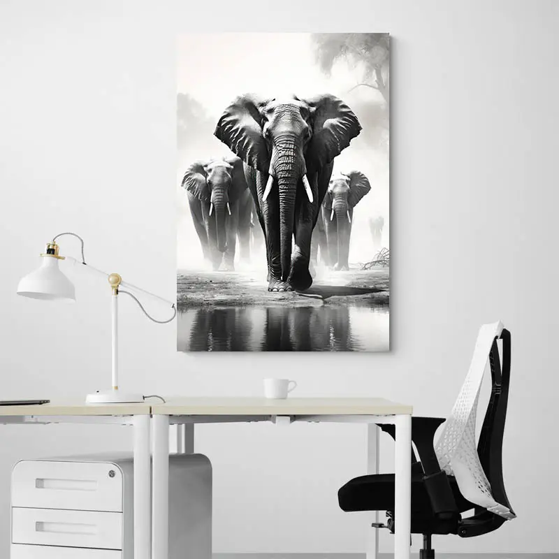 Ce tableau éléphant noir et blanc, c'est plus qu'une simple image. On sent toute la sagesse de l'animal à travers ces nuances contrastées. La texture de sa peau, les rides profondes, ses défenses puissantes... tout est là, en pleine lumière, et ça donne vraiment envie de s'arrêter un instant. Comme si l'éléphant allait sortir du cadre pour venir vous saluer.