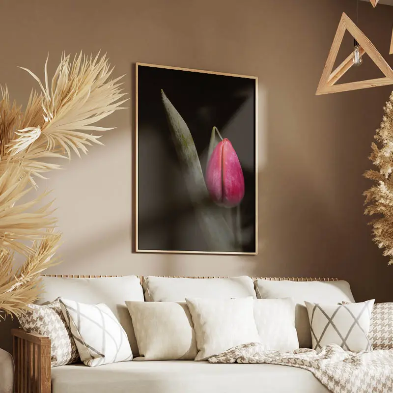 Ce tableau d'une tulipe rouge capture un instant précieux avec une proxi photographie pleine de délicatesse. On y voit cette fleur encore toute fraîche, presque en attente de s'épanouir. Ce qui frappe tout de suite, c'est ce contraste puissant : le rouge éclatant des pétales face au vert vibrant de la feuille, posés sur un fond noir intense qui fait tout ressortir avec une force incroyable.