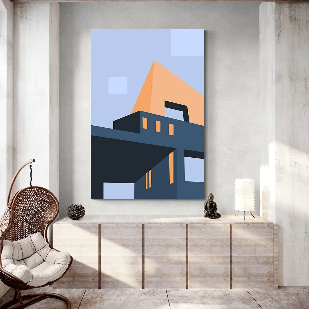 La palette est sobre et maîtrisée. Bleu nuit, bleu ciel, quelques touches d’orange chaud. Pas de détail inutile. Ce tableau architecture design repose sur l’équilibre. Il évoque le calme, la rigueur, presque un silence visuel. On l’imagine très bien dans un espace clair, moderne, presque vide. Il apporte de la profondeur sans jamais alourdir l’ambiance.
