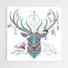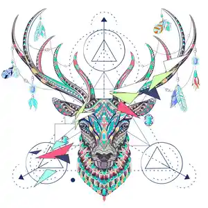 On adore l'énergie qui se dégage de ce tableau. Le cerf, avec ses bois ornés de plumes et de pendentifs, semble tout droit sorti d'un rêve mystique. Il est représenté avec des formes géométriques colorées, comme une constellation d'émotions figées dans le dessin. C'est fort, c'est vivant, c'est presque chamanique.