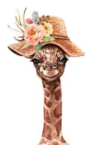 Dans ce tableau d'une girafe avec un chapeau, une girafe se tient fièrement au centre de l'image. Son regard enjoué et sa tête sont rehaussés par un chapeau à larges bords qui lui donne un air distingué. Ses grands yeux noirs brillent de curiosité. On a l'impression qu'elle vient juste de se mettre sur son trente-et-un pour une occasion spéciale. Elle semble être en train de contempler quelque chose au loin. Ce tableau est rempli de couleurs sobres avec un fond uni blanc qui se mêlera harmonieusement à tout type de décoration. Avec cette création vous aurez l'impression d'être transporté dans un monde exotique et merveilleux, peuplé de créatures élégantes et surprenantes.