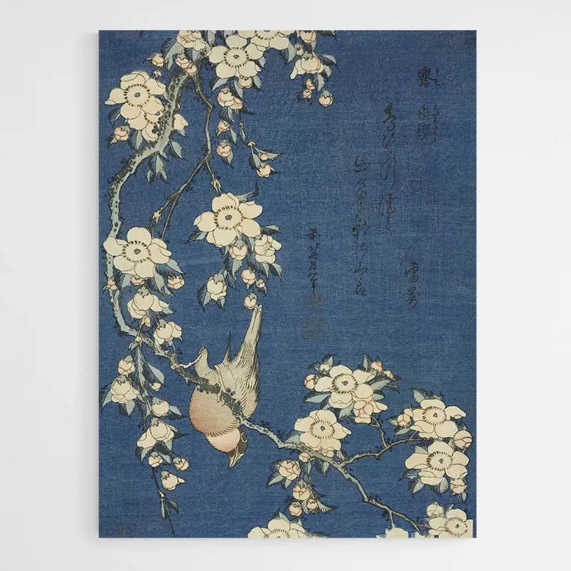 Ce tableau d'un Cerisier du maitre Hokusai représente un spectacle naturel caractéristique de son pays, le Japon. Sur cette estampe il s'agit donc d'un duo constitué d'un volatile et d'une fleur. Mais plus précisément d'un bouvreuil et de fleurs de cerisier, l'arbre emblématique du Japon. En effet, le cerisier ou sakura est un symbole très connu du Japon, ses fleurs demeurant la fleur nationale. Elles émergent rose clair et blanches et poussent librement à partir de la branche. Cette composition a été réalisée au printemps. Le moment où l'on peut le mieux observer ces fleurs, notamment sur l'île d'Hokkaido, particulièrement réputée pour ses nombreux cerisiers.