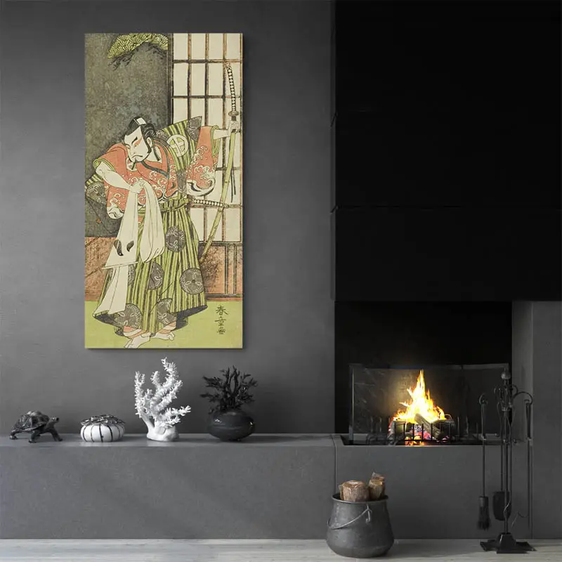 Cette Estampe d'un Samurai d'Hokusai l'un des plus célèbres artistes japonais représente l'acteur Otani Hiroji III dans le rôle de Kawazu no Saburo dans une pièce de théâtre Myoto-giku Izu no Kisewata, jouée au théâtre Ichimura en 1770. En effet, Hokusai a réalisé durant sa vie de nombreuse estampe de pièce et ses acteurs qui l'on marque. Sur cette œuvre en particulier nous pouvons voir un samurai en tenue traditionnelle portant ses katanas à bout de bras, un symbole de la culture nipponne.