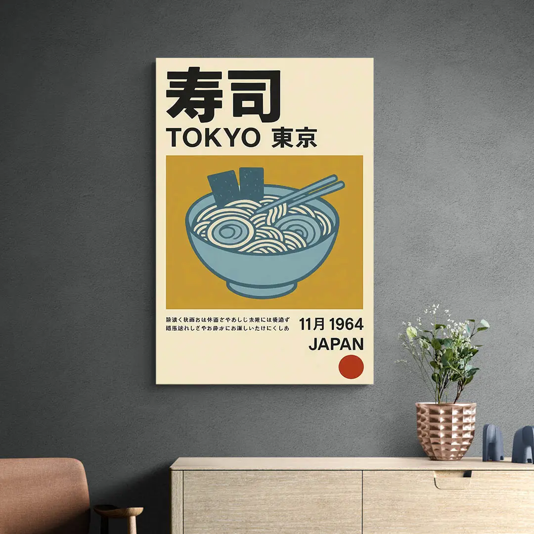 Ce qu’on aime ici, c’est la douceur des couleurs. Le bleu-gris du bol, le fond moutarde, les baguettes posées sur les nouilles en spirale… Tout est pensé pour évoquer à la fois la tradition et le graphisme japonais des années 60. L’ajout des caractères nippons et la date "Novembre 1964" renforce ce sentiment d’authenticité, comme si on avait retrouvé une vieille affiche d’époque.