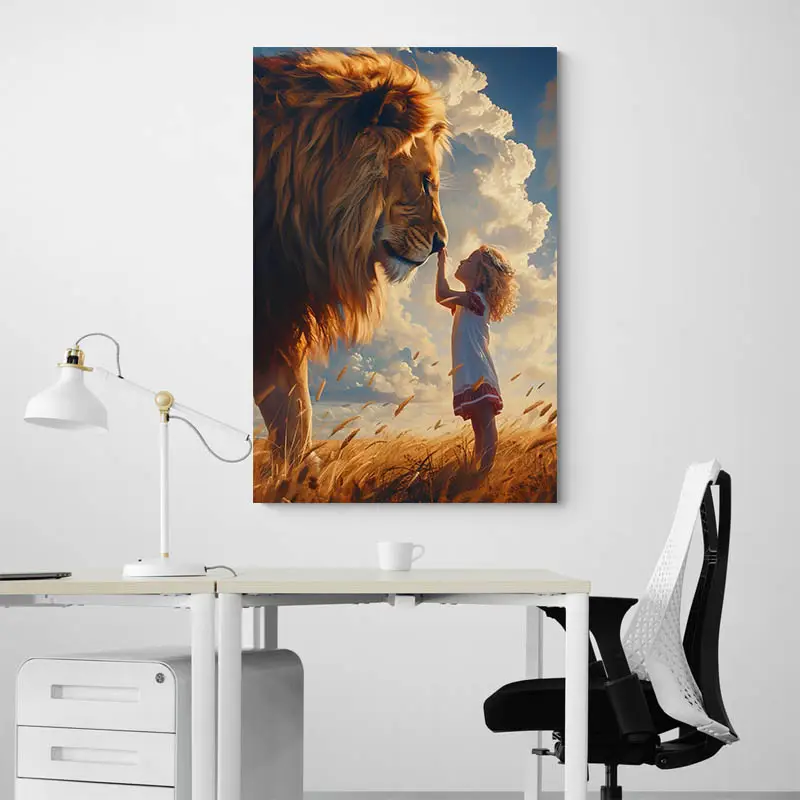 Tableau Lion et Petite Fille : Un Équilibre Entre Force et Douceur
