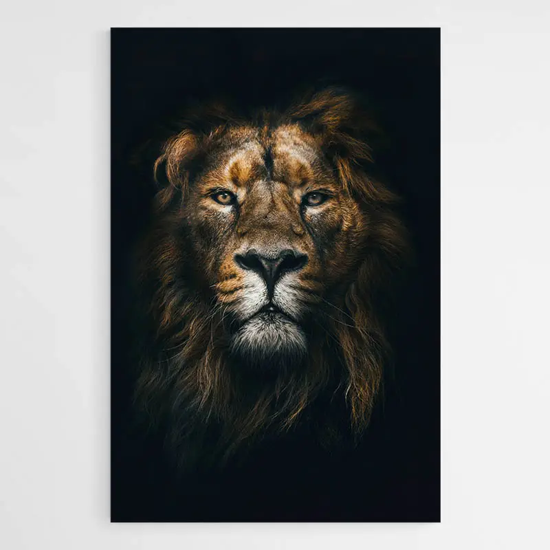 Ce tableau d'un portrait de Lion sur fond noir va impressionner vos invités. La taille surdimensionnée de sa tête et l'effet de perspective comme si le lion sortait du tableau en font une œuvre magnifique. Le contraste et les détails des poils du lion rendent cette création très artistique et incitent à regarder de plus près.