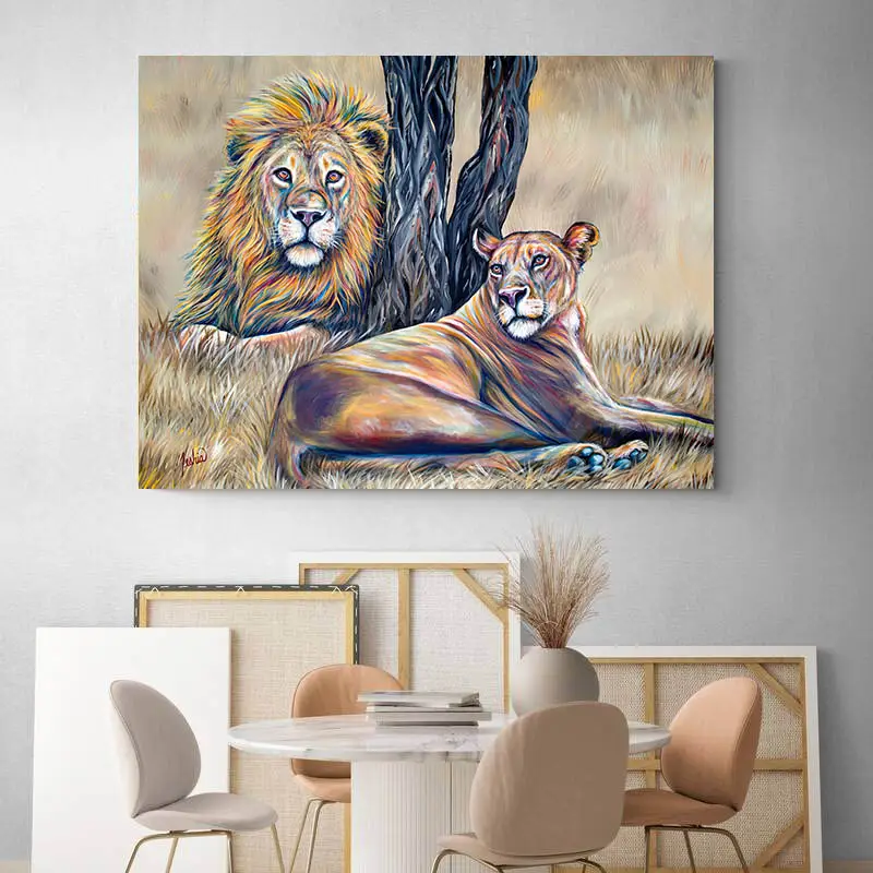 Ce superbe tableau d'un lion dans la nature représente un lion et une lionne dans leur habitat naturel. Les couleurs laissent transparaître celle de la savane. Des teintes beiges et sable qui inspirent les couleurs de la savane et des plaines africaines. Ce tableau Lion nature trouvera sa place dans une décoration sobre et dans des pièces avec des couleurs pastel et claires.