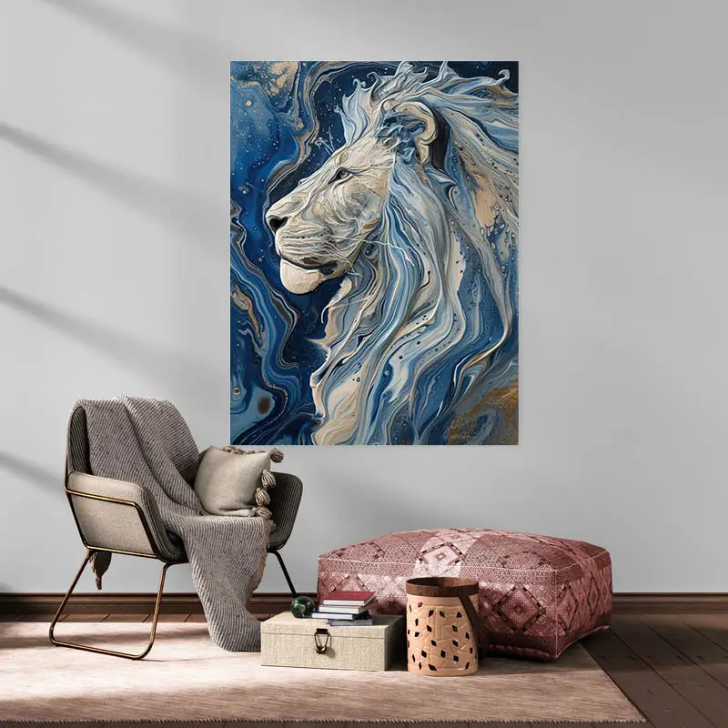 Ce Tableau Lion Bleu utilise les techniques de peinture fluide, un style contemporain où les couleurs se mêlent dans un effet de mouvement continu. C'est ce qui donne à cette œuvre sa profondeur et son intensité. Pour en savoir plus, découvrez cet article sur la peinture fluide, une technique aussi fascinante que libératrice.
