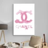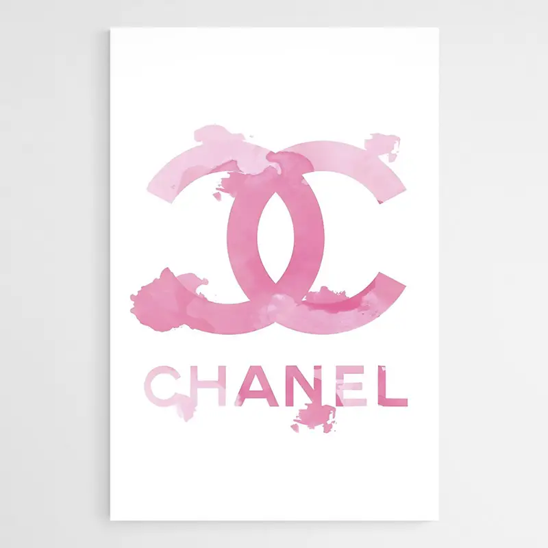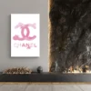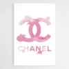 Ici, tout repose sur la simplicité : le fond blanc, le logo double C au centre, et le mot CHANEL en dessous. Le rose n’est pas criard, il est léger, un peu effet peinture/trace, ce qui donne une présence élégante sans remplir le mur. C’est le genre de tableau qui habille une pièce en restant propre.