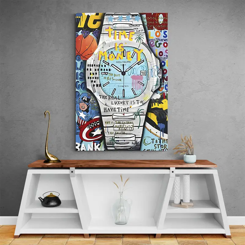 On reconnaît immédiatement la forme iconique de la montre, mais ici elle est bousculée par des graffitis, des couleurs franches et des messages écrits à la main comme “Time is Money”. Le contraste entre l’univers du luxe et l’énergie brute du street art crée une tension visuelle forte. C’est un tableau qui parle d’ambition, de réussite et de rapport au temps.