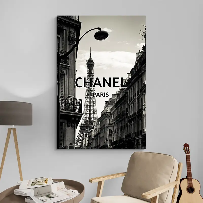 La Tour Eiffel se dresse au centre de la composition, encadrée par l’architecture parisienne. Le regard est naturellement guidé vers elle, tandis que le logo Chanel s’impose avec sobriété. L’ensemble évoque le luxe à la française, sans démonstration excessive.