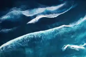 Il y a juste quelque chose d'incroyablement stimulant dans ce tableau océan et dans les mers du monde en général. C'est peut-être la nature impitoyable de l'océan en matière de météo et de vagues puissantes. Ou peut-être est-ce parce que la mer ne se laisse pas déranger et influencer par nous, les humains. Quand un marin part en mer, il doit s'adapter à l'océan, et non l'inverse. Tout au long de l'histoire, les humains ont eu du mal à défier et à « battre ' la mer. Cette toile représente donc une photographie aérienne de l'océan. Nous pouvons y observer l'écume des vagues et leurs formes aléatoires. Une composition calme et fascinante.