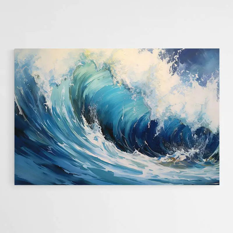 Ce qu'on ressent face à ce tableau peinture mer moderne, c'est d'abord la puissance. Une vague immense, comme figée en plein mouvement, prête à se refermer mais suspendue dans le temps. On a l'impression d'entendre le bruit sourd de l'écume, presque de sentir les embruns. C'est bluffant.