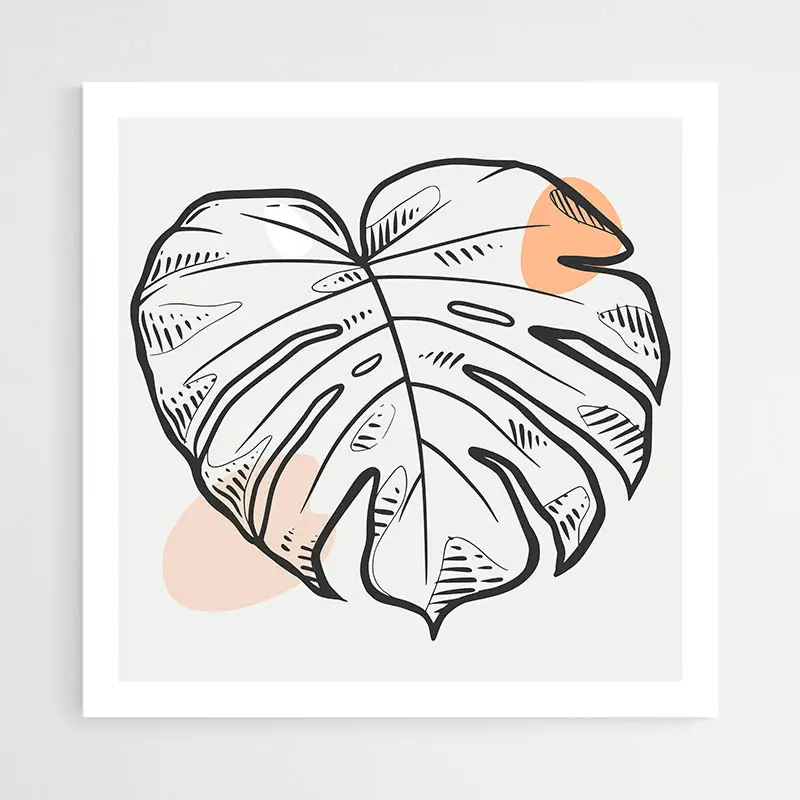 Une feuille tropicale, un fond uni de couleur douce, des formes géométriques, et une parfaite harmonie. Une recette parfaite pour ce dessin d'une feuille minimaliste pour vous offrir une toile élégante, simple qui apportera à coup sûr de la modernité dans votre décoration d'intérieur.