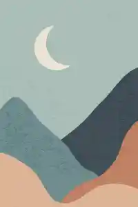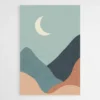 Sublimez votre décoration d'intérieur avec ce somptueux dessin minimaliste de paysage. Y sont représentées des montagnes de différentes couleurs avec un style minimaliste surplombé par un croissant de lune baignant dans un ciel bleu immaculé de nuages.