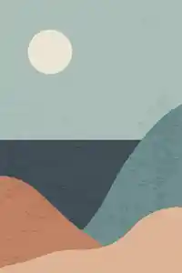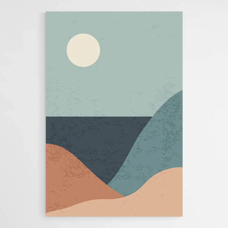 Sa décoration d'intérieur permet d'insuffler ses loisirs, ses envies et sa personnalité au cœur de son domicile. C'est pourquoi, si vous aimez l'art minimaliste, ou les voyages et les panoramas, ce dessin minimaliste voyage est fait pour vous. C'est une composition simple et efficace. Au premier plan, nous pouvons voir des montagnes faites de couleurs différentes avec du beige et du bleu qui a pour effet de faire ressortir l'océan plus sombre juste derrière. En arrière-plan nous pouvons observer un ciel d'un bleu très clair surplombé par un astre au centre de ce dernier, ce qui fait penser a une agréable journée d'été dans un lieu paradisiaque. C'est l'une des raisons qui donne à ce tableau un sentiment de vacance et de voyage.