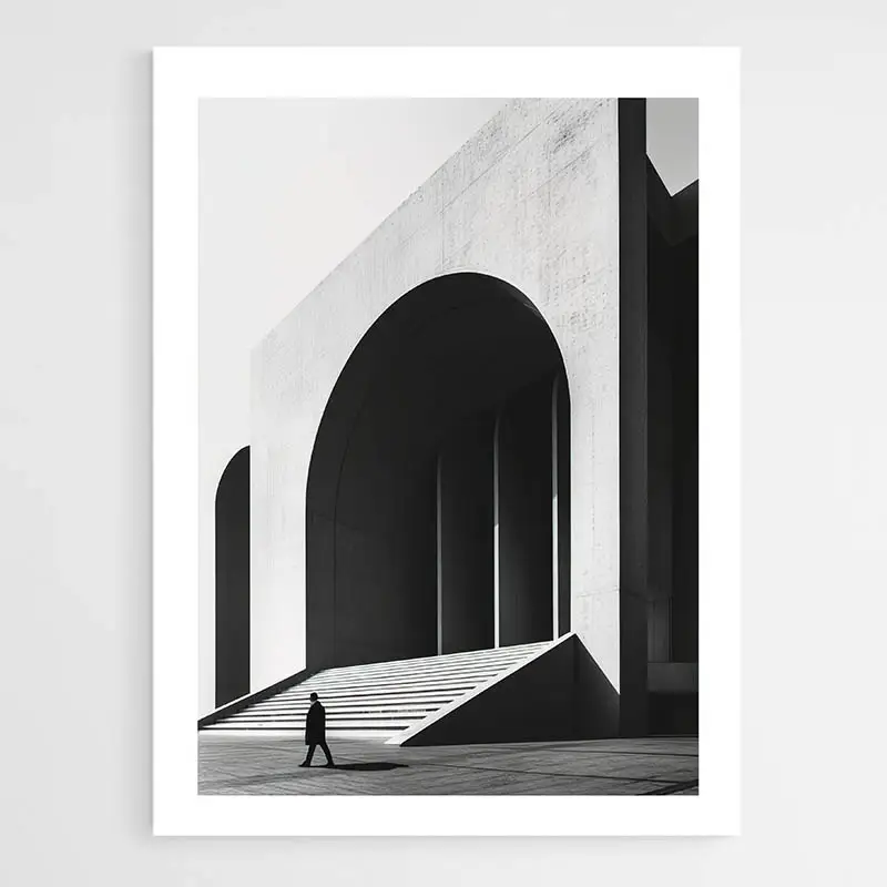 Il y a des images qui parlent tout de suite, sans besoin de couleur ni d'artifice. Ce tableau architecture noir et blanc, c'est exactement ça. Une composition forte, graphique, très maîtrisée. On dirait presque une photographie d'architecture en pleine lumière, où chaque ligne, chaque ombre a été pensée avec soin.