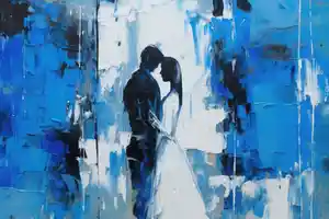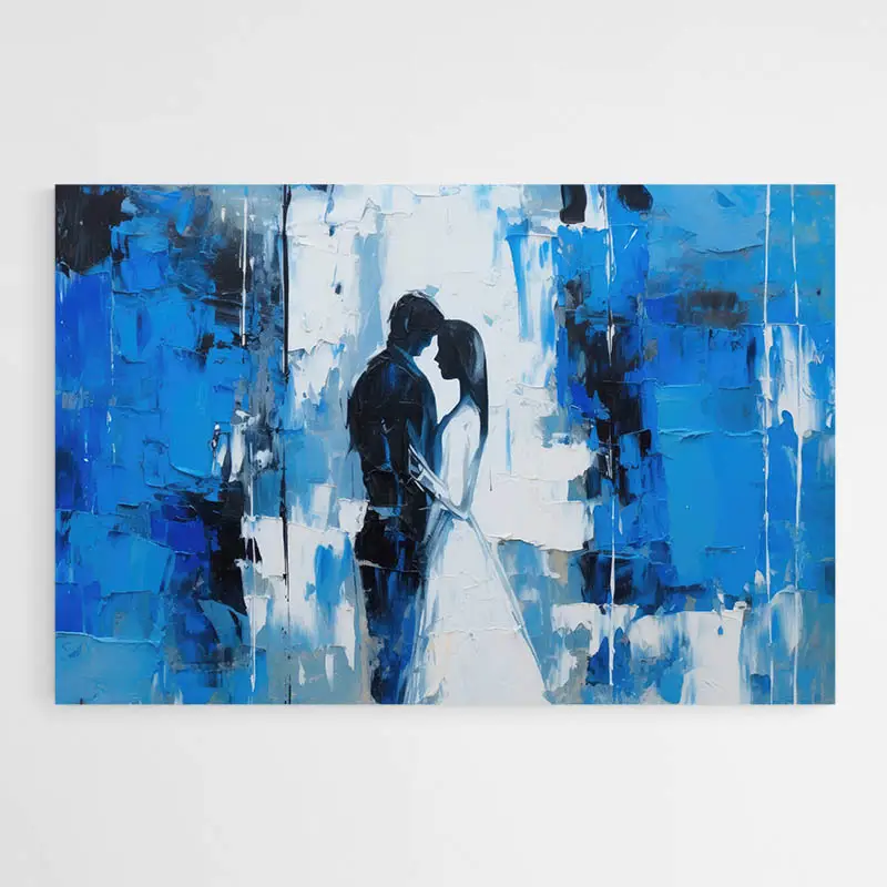 Ce tableau amour moderne, il a ce petit truc en plus. Celui qui fait qu'on s'arrête, qu'on le regarde, et qu'on ressent. On y voit un couple qui s'enlace, dans une sorte de danse silencieuse, enveloppés dans des nuances de bleu et de blanc qui semblent flotter doucement autour d'eux.