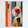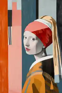 Cette pièce artistique est une ode à la beauté féminine et à sa capacité à rester envoûtante à travers le temps. Elle porte un turban d'un rouge passionné, rappelant les toiles des maîtres classiques, tout en étant posée sur un fond aux motifs modernes et abstraits qui ajoutent une touche de fraîcheur et d'audace à l'ensemble.