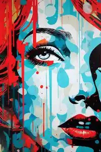 Ce qu'on aime particulièrement ici, c'est le jeu des teintes. Des bleus profonds, des rouges éclatants, quelques touches sombres qui donnent du relief... L'ensemble est puissant, presque électrique. Et puis ces coulures, ces éclats, ça donne un côté brut et spontané à l'œuvre, comme une émotion qui aurait été peinte sur le vif. On sent que ce portrait ne cherche pas à plaire, mais à raconter quelque chose.