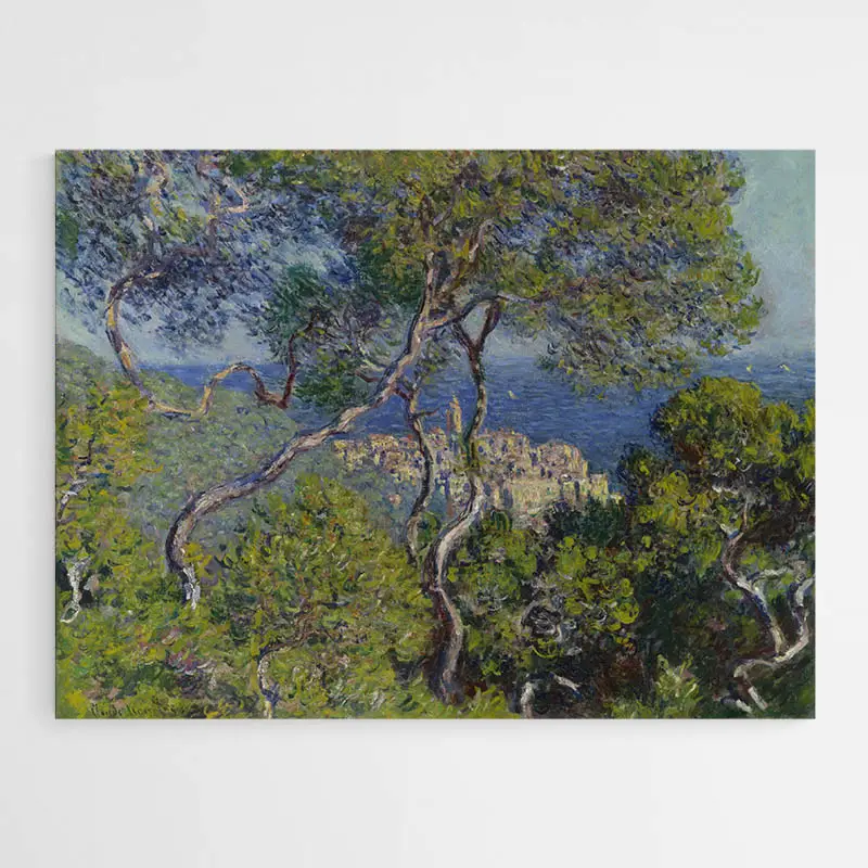 Au commencement de 1884, Claude Monet alla à Bordighera, une commune de la Riviera italienne à petite distance de la frontière entre l'Italie et l'Hexagone, pour une tournée de travail de trois semaines qui se métamorphosa en près de trois mois. Dans un courrier au sculpteur Auguste Rodin dépeignant ses essais pour capturer l'éclatante lueur méditerranéenne, Monet a affirmé qu'il « escrimait et luttait, avec le soleil '. Dans de différents messages, il s'indigne de la difficulté de dénicher un sujet décent au milieu de la foisonnante flore de la province. Dans cette peinture submergée de soleil représentée d'un point de vue à la cime d'une montagne, les flots sont à peine observables au milieu des troncs entrecroisés des pins régionaux.