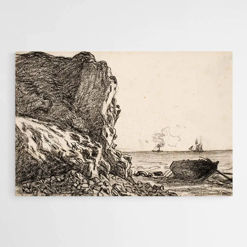 Tout au long de sa vie, l'artiste français a utilisé des carnets pour griffonner des dessins comme on prend des notes, dont ce Dessin de Monet réalisé en 1864 qui représente les falaises et la mer de Sainte-Adresse. Il existe 8 de ces carnets que vous pouvez visualiser page à page sur internet. C'est l'artiste à l'œuvre, le tout début du déroulement de la réalisation d'une œuvre qui se révèle à mesure qu'on parcourt ses esquisses. Plein de dessins sont tête-bêche. On visualise l'artiste, livre en main, en train d'ouvrir le calepin et de le retourner de manière à obtenir la couture du carnet à sa gauche. Il ne se prend pas la tête, faire un beau dessin n'est pas son objectif premier. Ce sont des notations de travail comme un bloc-notes pour nous et pour lui seul. En effet ces carnets n'étaient pas rendus publics, c'est le secret de l'élaboration de son travail. Il souhaite également se rappeler de cadrages, il essaie. Il détermine un format distinct du rectangle de la page en le tranchant le cahier d'un trait fin.