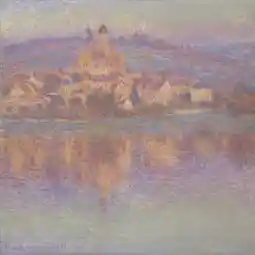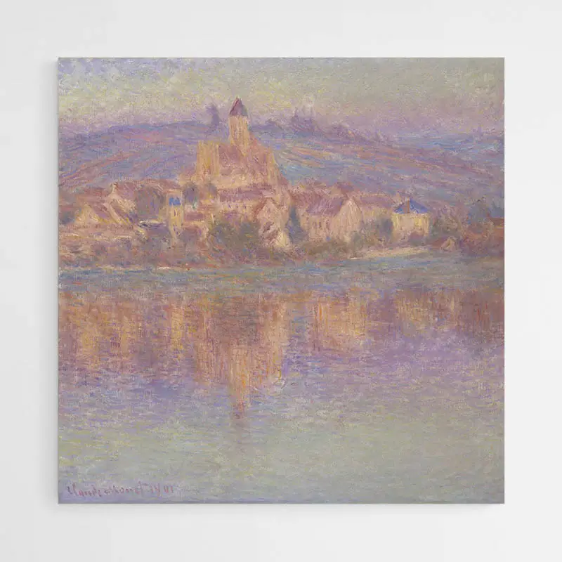 Pendant l'été de 1901, Claude Monet se rend à Lavacourt, où il réserve une modeste demeure pour peintre cette toile de Maison de Vétheuil - Monet. Dans cette municipalité sillonnée par la Seine, à faible distance de Giverny où se trouve sa demeure principale. Il s'installe sur sa terrasse pour peindre. Il réalise alors une quinzaine de peinture dont celle-ci et une deuxième disponibles sur Tableaux du Monde. Toutes les toiles orbitent autour de la même vue de la commune. On y observe les berges de la Seine avec un petit morceau de la ville, avec le sommet de sa chapelle, élément central du tableau. Cette peinture a été effectuée en plein après-midi . L'autre version de cette même vue disponible sur notre site est réalisée au coucher du soleil,où les nuances sont différentes prodiguant des teintes roses et orangées à l'œuvre. Ces deux peintures sont réalisées sur des toiles qui sont quasiment carrées, octroyant à Monet la possibilité d'établir un agencement cohérente et simple en séparant en deux hémisphères son travail. Sur la partie supérieure de la toile, il reproduit la ville et sur la partie inférieure, la Seine.