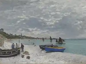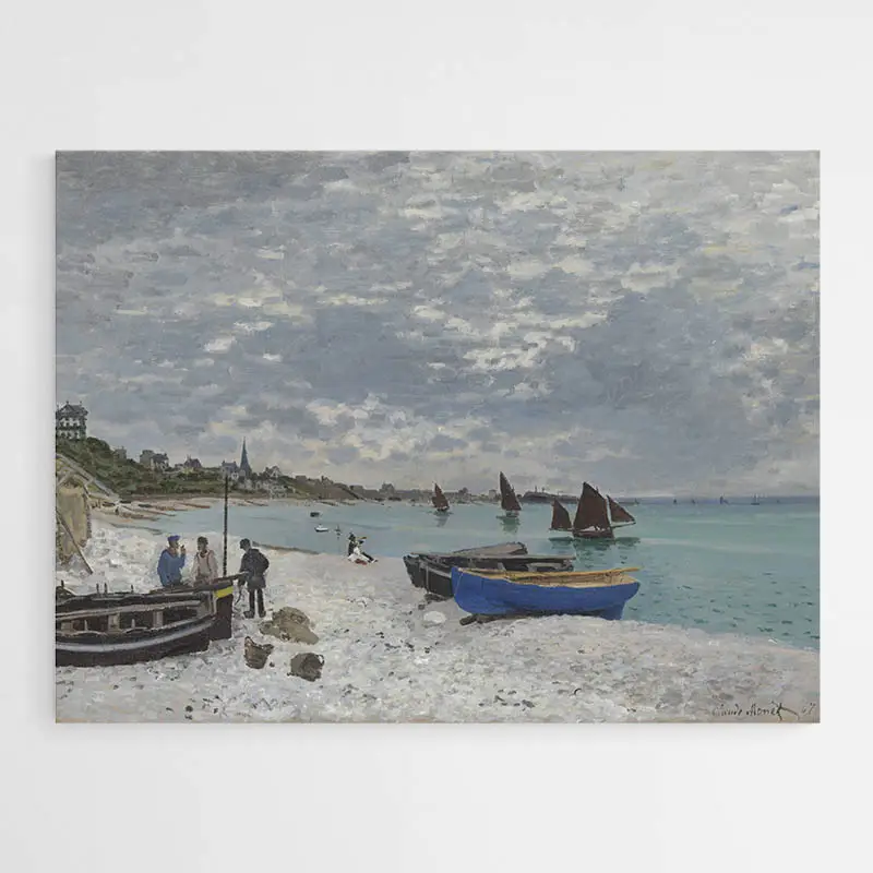 Le peintre a commencé cette peinture de Sainte-Adresse de Monet à l'extérieur lors d'une journée couverte, mais a vraisemblablement retravaillé la configuration de ce tableau dans son atelier de sa demeure principale en vue de différentes toiles afférentes. L'analyse technique a dévoilé que Claude Monet a commencé cette toile avec une scène de yachts et de vacanciers à la plage qui s'est au dernier moment transformée en une vue de bateau à voiles et de pêcheurs locaux certainement pour ajouter de l'authenticité à la composition. Monet a présenté cette œuvre picturale à l'exposition impressionniste de 1876.