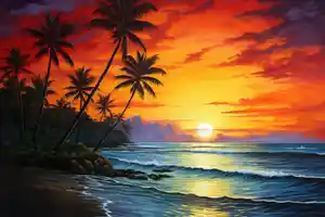 Ce qu'on adore ici, c'est l'atmosphère. Les palmiers, les reflets sur l'eau, ce petit vent imaginaire qu'on imagine dans les feuilles. Tout dans ce tableau respire le calme, la chaleur, les fins de journée d'été qu'on ne veut jamais voir finir.