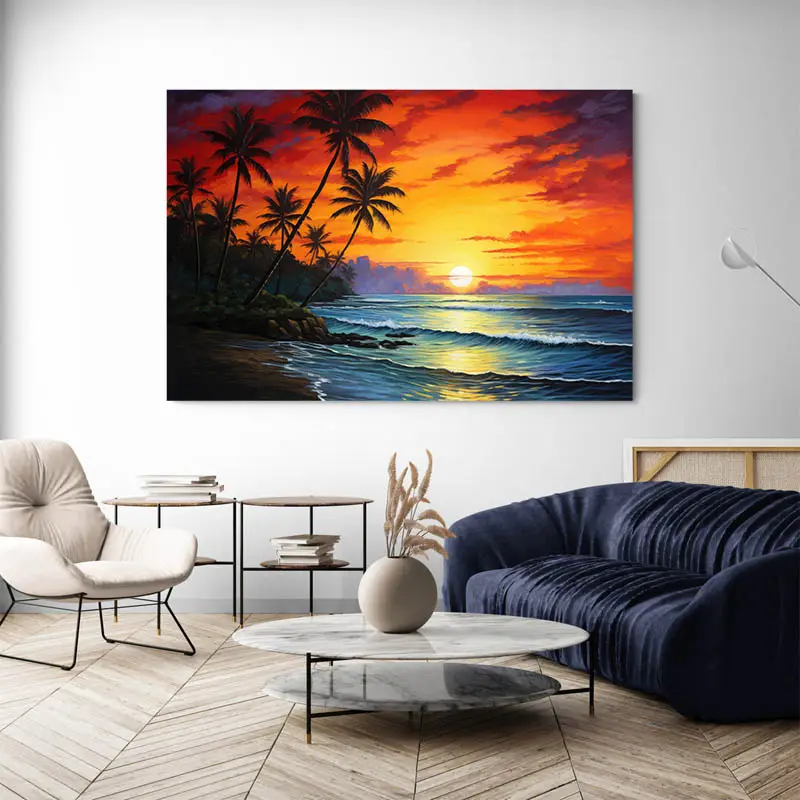 Le Tableau Peinture Coucher de Soleil, c'est ce genre de tableau qui nous arrête net. On le regarde, et tout d'un coup, on respire un peu mieux. Les couleurs ? Un mélange de rouge flamboyant, d'orange lumineux, de jaune doré... bref, une vraie caresse pour les yeux. On dirait que le soleil s'amuse à peindre le ciel, et qu'il y met tout son cœur.