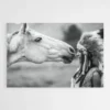 Ce tableau d'un Cheval et d'une Indienne en noir et blanc est tout simplement magnifique. Il représente la complicité entre l'homme et le cheval et véhicule un message de tendresse et d'amour envers les animaux. La beauté du cliché en fait une œuvre unique et superbe.