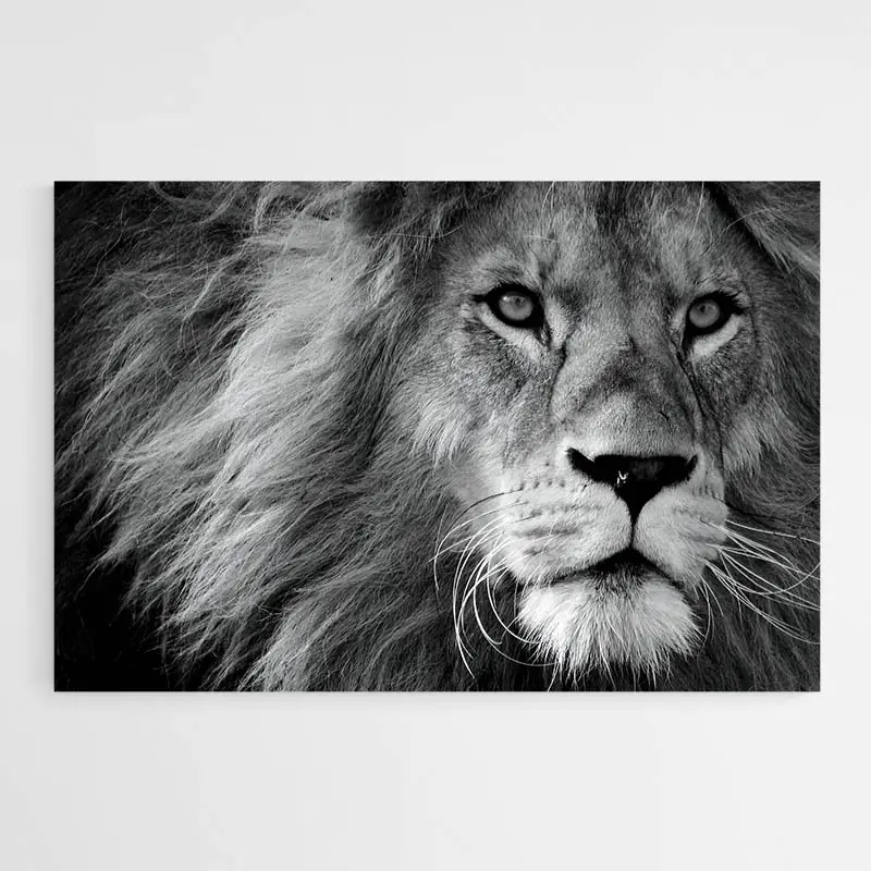 Ce tableau d'un lion noir, c'est une magnifique photographie en noir et blanc d'un lion de face. La photographie réalisée sur fond noir avec un très fort contraste pour mettre en valeur les poils de la bête. Son regard est tourné vers l'horizon et il est perçant. Le fauve semble surveiller sa proie. Le choix du noir et blanc pour cette photographie fait ressortir le pelage du félin. Il est préférable de choisir cette toile dans un très grand format afin de préserver les plus petits détails de cette magnifique photographie.