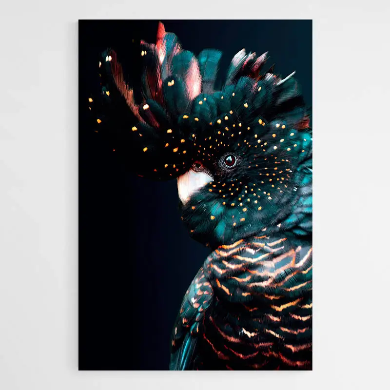 Ce tableau d'un perroquet noir fera de votre salon un espace contemporain hors du commun. Le perroquet représenté sur cette toile est très particulier, une espèce rare au plumage noir et blanc avec quelques touches d'orange. Mais ce qui donne de la profondeur à cette œuvre sont les détails du plumage de l'oiseau. C'est une toile qui ravira les amateurs de perroquet et de photographie animale.
