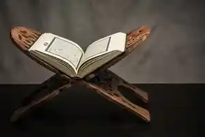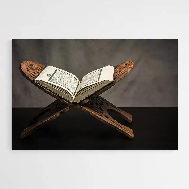 Ce tableau du coran nous montre une photographie du livre sacré de l'islam posé sur un porte-Coran en bois, le tout sur une table noire. Le Coran est ouvert et repose sur le support emblématique des mosquées. Ses pages sont illuminées par une source de lumière qui éclaire également la pièce de manière divine. Le porte-Coran est simple et élégant. La table noire ce qui créer un contraste frappant avec le bois clair et les pages blanches du livre. L'ensemble crée une atmosphère de calme propice à la réflexion.