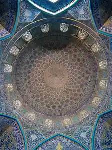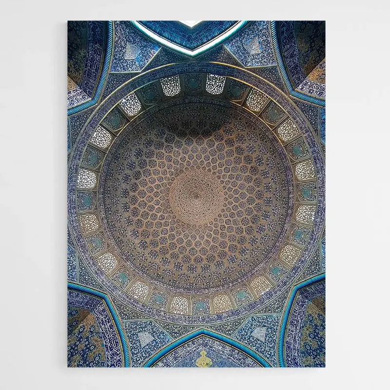 Ce tableau oriental bleu nous montre le plafond de la mosquée de Sheikh Lotfollah à Isfahan. Construite sous le règne de Shah Abbas I, la mosquée Sheikh Lotfollah a été achevée en 1619 et était destinée à l'usage exclusif de la famille royale. C'est un exemple de l'architecture iranienne de haut niveau. Il est recouvert de plaques de miroir et de carreaux de faïence bleus, créant une mosaïque scintillante qui reflète la lumière naturelle. Il est également rempli de motifs géométriques et floraux qui sont habilement disposés pour créer une impression de profondeur et de mouvement. Les détails délicats et l'exécution précise montrent la maîtrise technique des artisans de l'époque Safavide. Ce plafond est considéré comme l'un des chefs-d'œuvre de l'architecture islamique et continue d'être admiré pour sa beauté et sa sophistication.