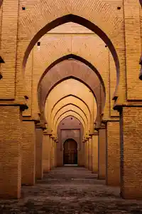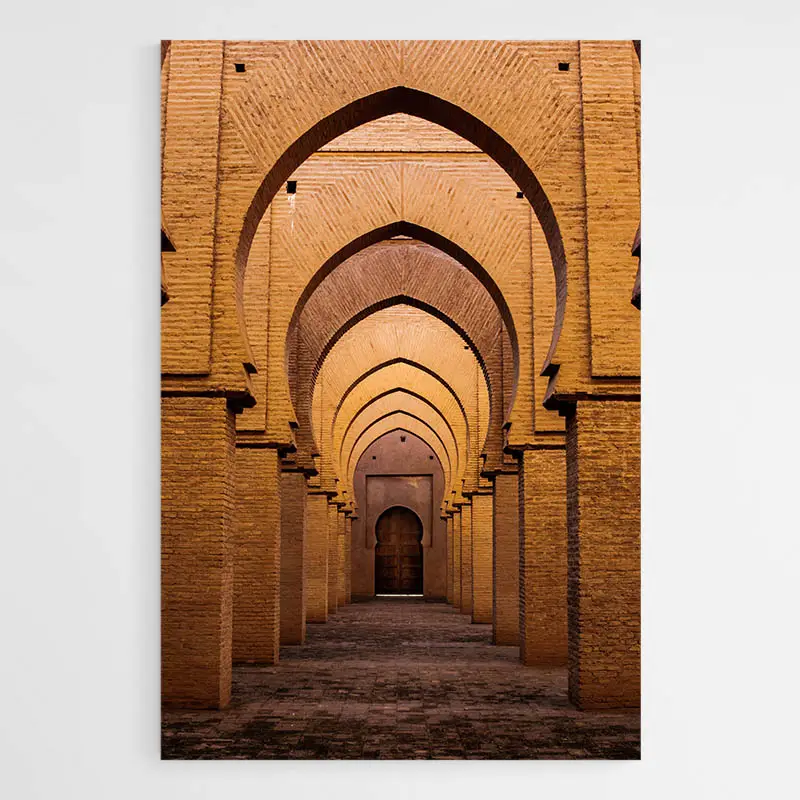Le tableau représente une porte marocaine en bois entouré d'arcs au style architectural de Tinmel, une ville située dans la région de Marrakech-Safi au Maroc. L'entrée semble petite au milieu de tous ces arcs imposants. On peut apercevoir des détails en fer forgé sur la porte au milieu du tableau qui reflètent l'influence de la culture berbère dans l'architecture du pays du célèbre désert du Sahara. Les arches ajoutent une dimension supplémentaire à la photographie avec une perspective marquée, ce qui met également en avant l'architecture de la ville. Le tableau capture l'essence de la culture marocaine et de son patrimoine architectural.