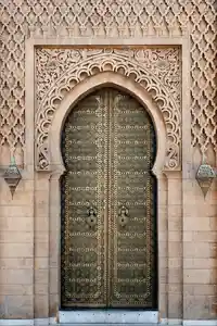 Ce tableau d'une porte orientale nous montre une photographie d'une grande porte en fer doré de style marocain, décorée de motifs orientaux d'une finesse absolue. La porte est imposante et majestueuse. Les ornements sur le mur de pierre qui entourent la porte sont plus grossiers, mais ajoutent une touche supplémentaire de complexité et de richesse au cliché. L'ensemble donne une impression de grandeur et de raffinement typique de l'architecture orientale.