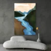 Ce tableau fonctionne très bien au-dessus d’un canapé droit ou d’un meuble bas, car la ligne de la rivière suit visuellement le dessus du mobilier. L’idéal est de placer son centre à hauteur des yeux pour profiter pleinement des reflets dans l’eau. Sur un mur gris clair, les verts et les jaunes prennent plus de relief. Si vous avez déjà des éléments déco nature (plantes, fibres tressées), ce paysage complète sans surcharger grâce à son fond lumineux.