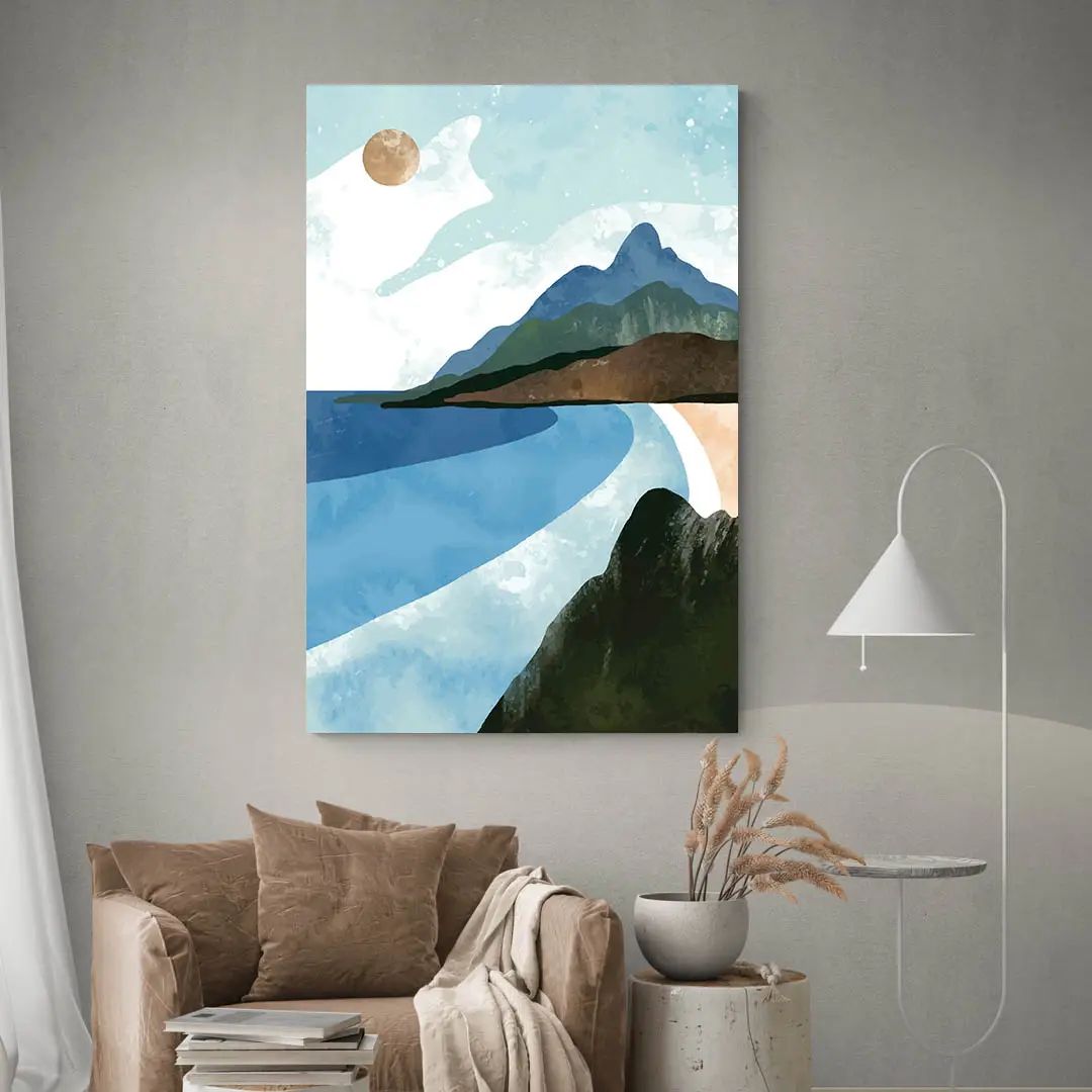 Placement idéal : intérieur contemporain avec mobilier épuré où ce rendu lumineux souligne le côté spectaculaire du paysage marin.