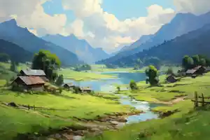 Ce tableau sur toile paysage, c'est exactement ce qu'il nous faut quand on a besoin de se reconnecter un peu. Il y a une vraie douceur dans cette scène, une sorte de tranquillité qui s'installe dès qu'on le regarde. Les montagnes au loin, un ciel bleu éclatant, quelques nuages légers... et cette verdure tout autour qui respire la vie. Franchement, on s'y croirait.