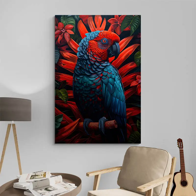 Si ce tableau vous plaît et que ces oiseaux tropicaux vous fascine vous pouvez alors réaliser une décoration sur le thème des perroquets avec nos autres tableaux d'un perroquet rose, d'un perroquet vert ou encore d'un perroquet blanc pour une cohérence artistique et une explosion de couleur.
