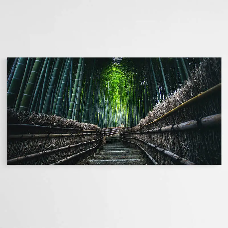 Ce tableau de bambou représente une photographie d'une forêt japonaise. Au Japon, l'agencement de jardins demeure un art majeur et admiré, partageant des normes symboliques. Les jardins japonais cherchent à incarner et magnifier la nature en réduisant les artifices. La plupart des jardins en Occident comme au Japon sont des jardins zen constitués de roches, mousses et de gravillons. La culture zen est un véritable état d'esprit au Japon.