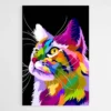 Ce tableau d'un chat Pop Art est à la fois discret et haut en couleur. Le fond noir du tableau contraste avec les poils multicolores du félin. Avec du blanc, du rose, du violet et du vert, ce chat donnera de la vie à votre décoration et fera succomber tous les amoureux des félins.