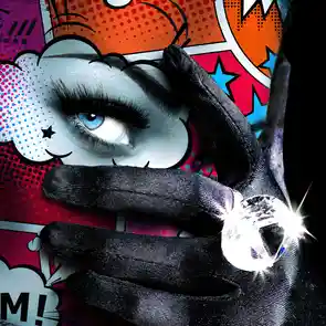 Ce tableau pop art diamant représente le visage d'une femme couverte d'illustration venant de la bande dessinée. On y voit un gant de velours avec un diamant venant cacher le visage de la femme. Une très belle œuvre pop'art qui trouvera sa place dans une déco de style contemporain.