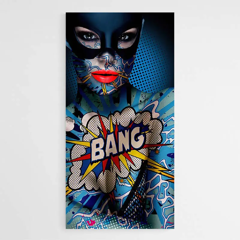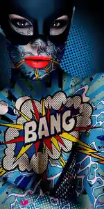 Ce tableau pop art nu met en avant le corps d'une femme masquée recouverte d'onomatopées. Une œuvre avec des dominantes de bleu et un contraste de rouge avec le rouge à lèvres de la femme. À la fois chic et pop art et s'inspirant du monde des super héros et de la bande dessinée. Une œuvre qui plaira forcément aux amateurs de pop art.