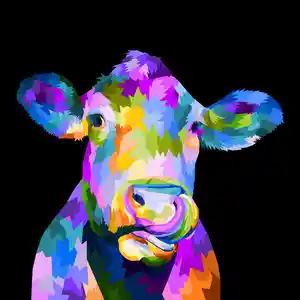 Ce tableau d'une vache pop art représente une tête de vache multicolore avec des couleurs vives. La tête de la vache est représentée de face et en gros plan. Nous pouvons observer ses yeux expressifs au milieu de son pelage multicolore. Les couleurs de cette toile passent du jaune au vert en passant par le bleu et le rouge. Le fond du tableau d'un noir profond et uni qui met en valeur la tête colorée de la vache. Le tableau semble prendre son inspiration du style pop art avec ses nombreuses couleurs vives.