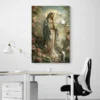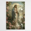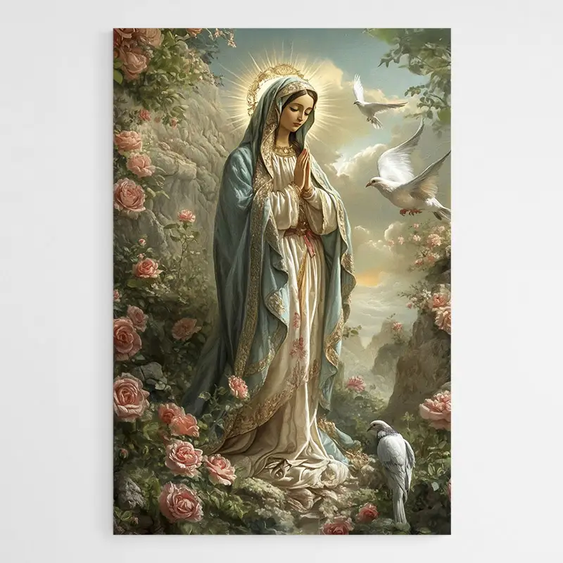 La Vierge Marie est représentée dans un jardin rempli de roses, entourée d’une lumière douce. Sa posture calme et les mains jointes créent une atmosphère de recueillement. L’ensemble diffuse une sensation de sérénité qui apaise immédiatement la pièce.