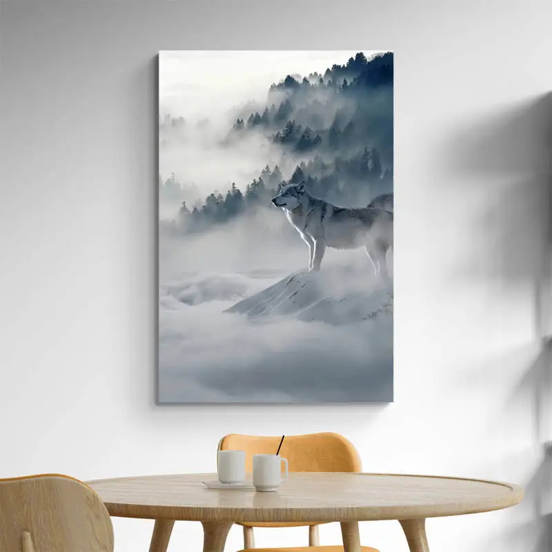 C'est tableau avec une ambiance scandinave met en avant un loup blanc dans la neige. Il est représenté dans une plaine recouverte de brume avec une magnifique forêt nordique en fond. Cette création est une idéalisation et une représentation telle que l'on imagine des paysages scandinaves. Une neige immaculée, de la nature, des loups blancs, une représentation tout droit sortie de l'imaginaire. Si vous souhaitez apporter un peu de nature à votre décoration, tout en restant sobre, ce tableau trouvera parfaitement sa place dans votre décoration murale.