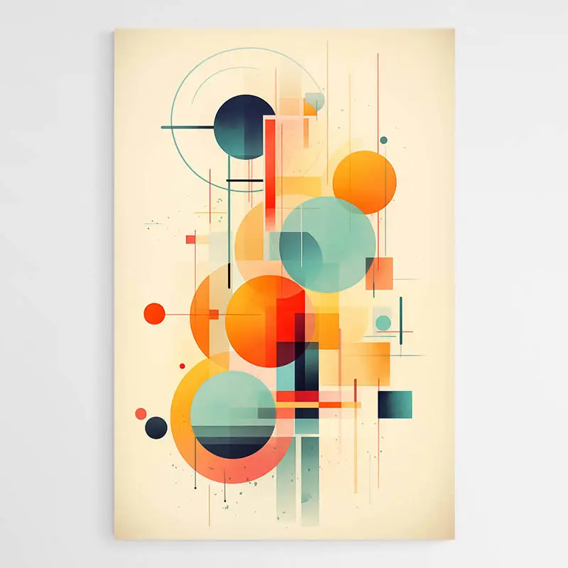 Le tableau géométrique moderne, c'est une vraie symphonie visuelle. Ici, la rigueur des formes rencontre la spontanéité des couleurs. Des lignes droites, des courbes audacieuses, des cercles et rectangles qui ne sont pas que des figures, mais des acteurs d'une histoire graphique. Chaque couleur, chaque forme a son rôle, dans un équilibre parfait entre ordre et fantaisie.