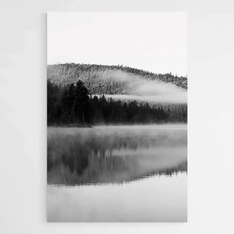 Ce tableau Lac et Montagne met en avant le paysage montagneux scandinave. Des couleurs désaturées, une dominante de noire et blanc inspirée par la neige et les sapins bordant le lac ainsi qu'une légère brume font de ce lieu un endroit hors du temps. Une scène qui inspire la tranquillité, le silence.